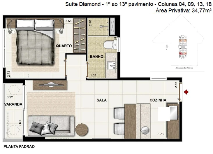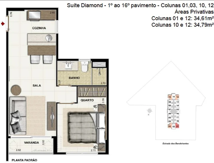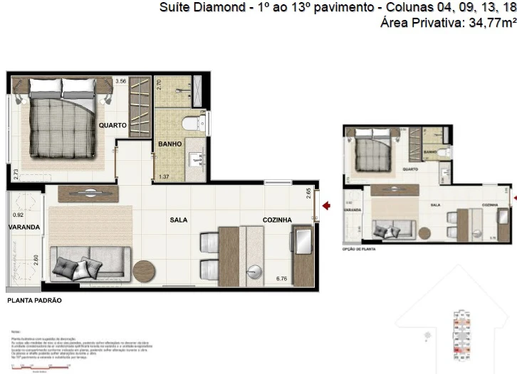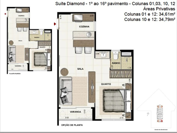 Apartamentos com quarto e sala de 34,61m2 até 34,71m2,